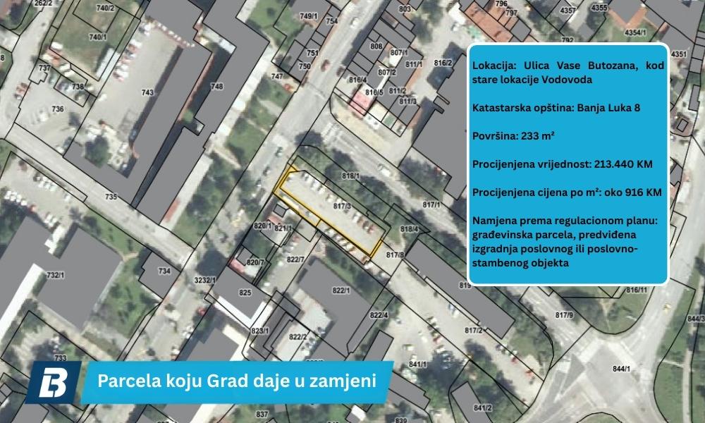 Prema dostupnoj dokumentaciji, Grad bi ustupio parcelu površine 233 kvadratna metra u Ulici Vase Butozana, ranije 22. april, kod stare lokacije „Vodovoda“, u centralnom dijelu grada. Riječ je o izgrađenoj gradskoj zoni, sa uređenim saobraćajnicama, kompletnom infrastrukturom i poslovnim objektima u neposrednoj blizini.