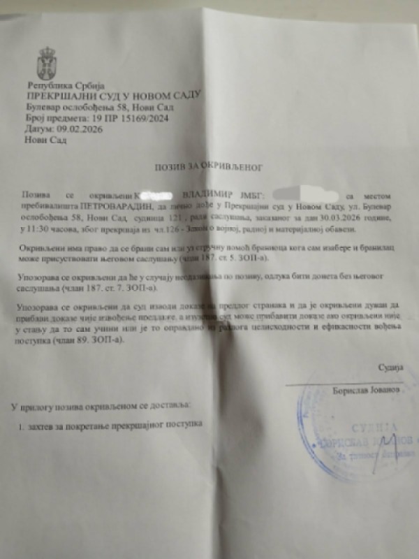 “Dobio sam poziv od Prekršajnog suda u Novom Sadu, kojim se nalaže moje lično prisustvo radi saslušanja zbog prekršaja Zakona o vojnoj, radnoj i materijalnoj obavezi. Očigledno je da se ova obaveza odnosi i na nas koji živimo van Srbije, ali imamo njeno državljanstvo”, kaže Vladimir za BL portal.