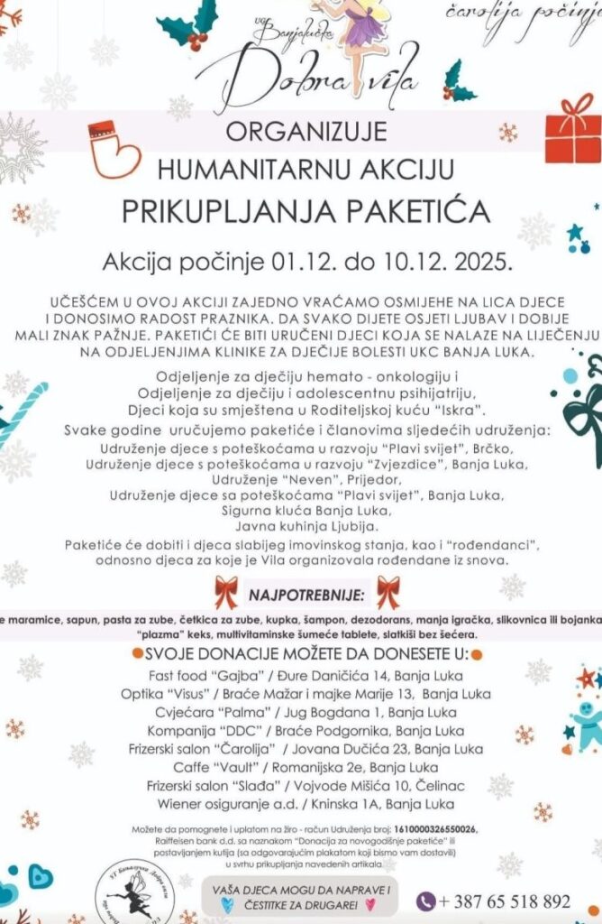 “Na ovaj način vraćamo osmijehe na lice djece i donosimo radost praznika, da svi dobiju mali znak pažnje. Paketići će biti uručeni djeci na odjeljenjima Klinike za dječije bolesti u Univerzitetskom kliničkom centru Republike Srpske, kao i mališanima koji se nalaze u Roditeljskoj kući “Iskra”, Javnoj kuhinji Ljubija i udruženjima koja se bave djecom sa poteškoćama u razvoju”, kaže Pejčinovićeva za BL portal.