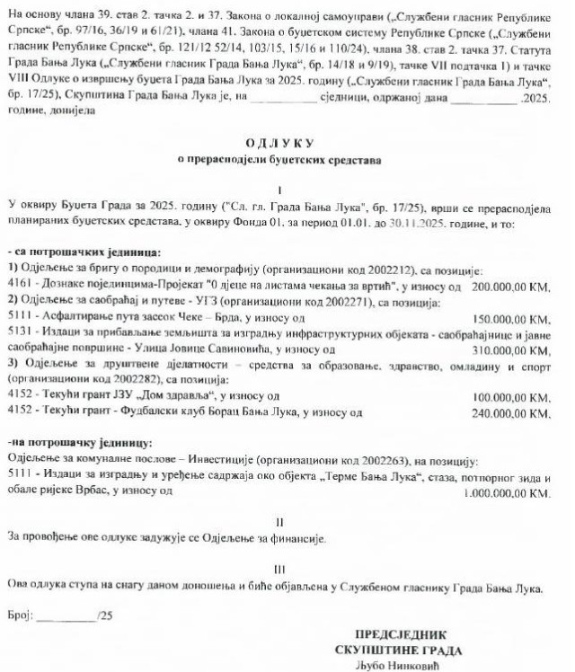 Na kraju, o preraspodjeli se govori i u tački 43, “sa pozicije: 4152 – ‘Tekući grant – Fudbalski klub Borac Banja Luka, na poziciju: 5111 Izdaci za izgradnju i uređenje sadržaja oko objekta ‘Terme Banja Luka'”. Ovdje je riječ o najvećem iznosu, odnosno 240.000 KM, piše Mondo.