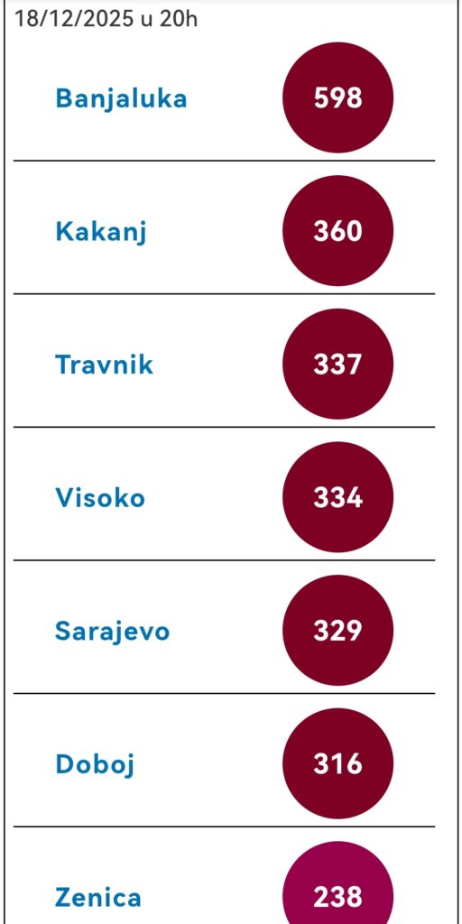 18.12.2025. | 20:08Prema podacima od 20.00 časova Banja Luka je sa indeksom kvaliteta vazduha od čak 598 najzagađeniji grad u Bosni i Hercegovini i vazduh je trenutno opasan za stanovništvo.