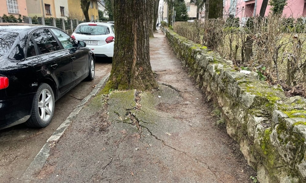 Na dijelovima gdje su stabla uz samu ivicu trotoara, asfalt je ispucao i podignut korijenjem. Prolaz je sužen ili potpuno zatvoren, pa pješaci moraju silaziti na kolovoz. To se posebno odnosi na djecu koja svakodnevno prolaze ovom ulicom na putu do škole.