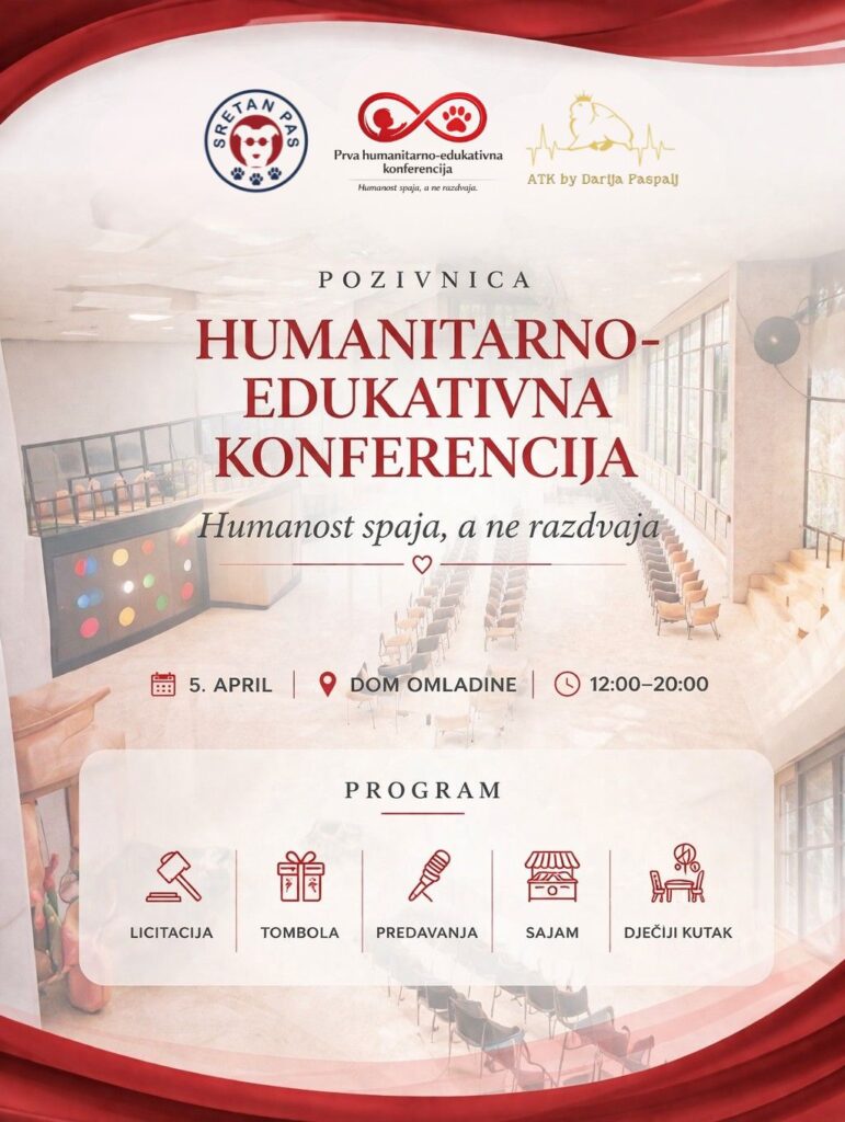 02.04.2026. | 09:28Prva humanitarno-edukativna konferencija „Humanost spaja, a ne razdvaja“, sa ciljem prikupljanja novčanih sredstava za liječenje Sergeja Stupara, biće održana 5. aprila u Domu omladine, a cjelodnevni događaj organizuje Udruženje za zaštitu i spašavanje životinja „Sretan pas“ u saradnji sa Darijom Paspalj i prijateljima, okupljajući edukativne, kulturne i zabavne sadržaje za sve generacije.