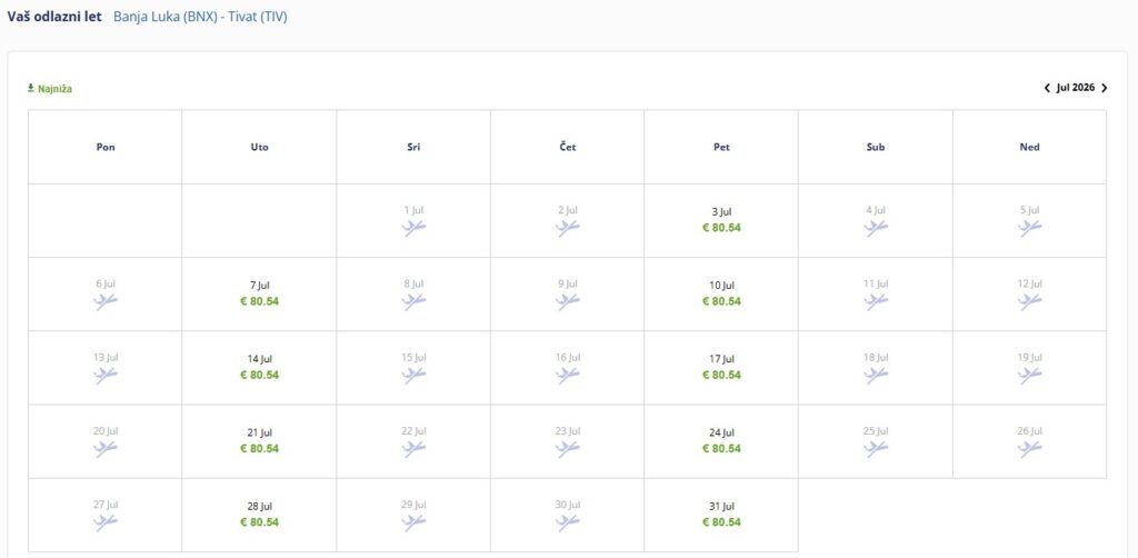 Povratni let iz Tivta za Banjaluku u ekonomskoj klasi košta 88,48 evra.