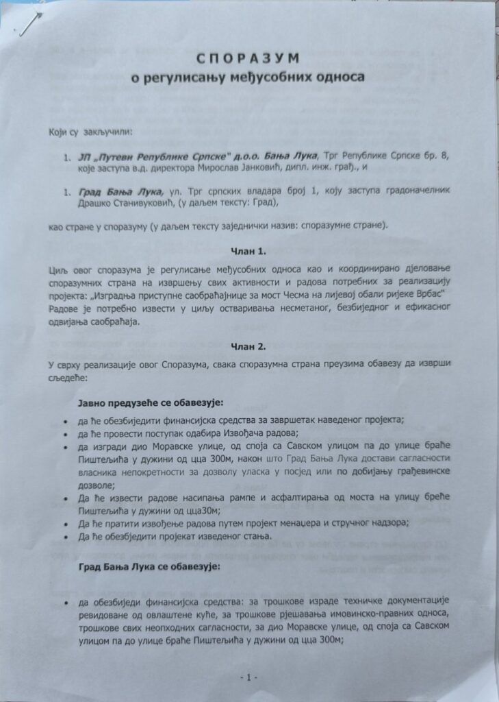 Iz ovog preduzeća ističu da su, odlukom Vlade Republike Srpske, preuzeli ne samo izgradnju mosta, već i pristupnih saobraćajnica, iako je prvobitno bilo predviđeno da taj dio realizuje Grad.