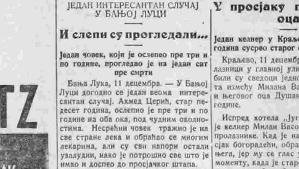 “U Banjoj Luci dogodio se jedan veoma interesantan slučaj. Ahmed Cerić, star pedeset godina, oslijepio je prije tri i po godine na oba oka, pod čudnim oholnostima. Nesrećni čovjek tražio je na sve strane lijeka i obraćao se mnogim ljekarima, ali su svi napori ostali uzaludni, iako je potrošio sve što je imao i dospio do prosjačkog štapa”, piše beogradsko “Vreme” 12. decembra 1934, i nastavlja: