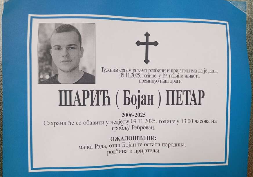 – Sahrana Petra Šarića će se obaviti u nedjelju 9. 11. 2025. godine u 13. časova na groblju Rebrovac. Ožalošćeni majka Rada, otac Bojan i ostala porodica, rodbina i prijatelji – piše na smrtovnici objavljenoj na društvenim mrežama.