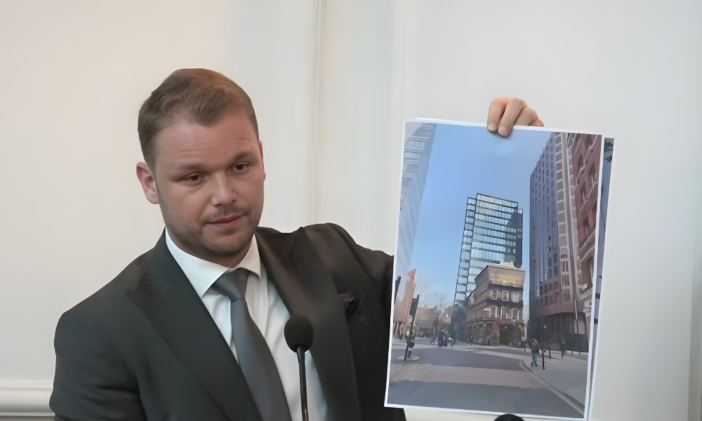 Tokom izlaganja pokazivao je fotografije londonskih zgrada, navodeći da se turisti okupljaju i fotografišu upravo na mjestima gdje se susreću različiti stilovi gradnje.