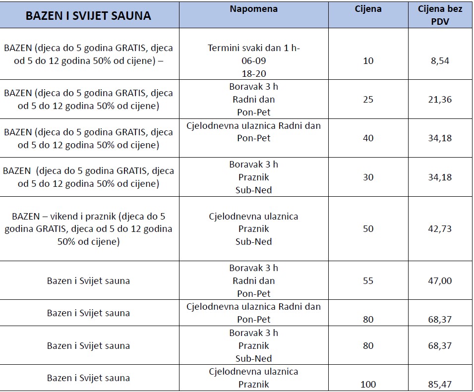Tako osnovna ponuda za korišćenje bazena i sauna, radnim danom na tri sata košta 55 maraka po osobi, dok, recimo, paket „VIP TOUCH DELUX“, za osam osoba i tri sata korišćenja, koji uključuje privatni relaks prostor sa saunom i džakuzi bazenom, uz posluženje aromatizovane vode, suvog voća i čokoladica košta 500 maraka.