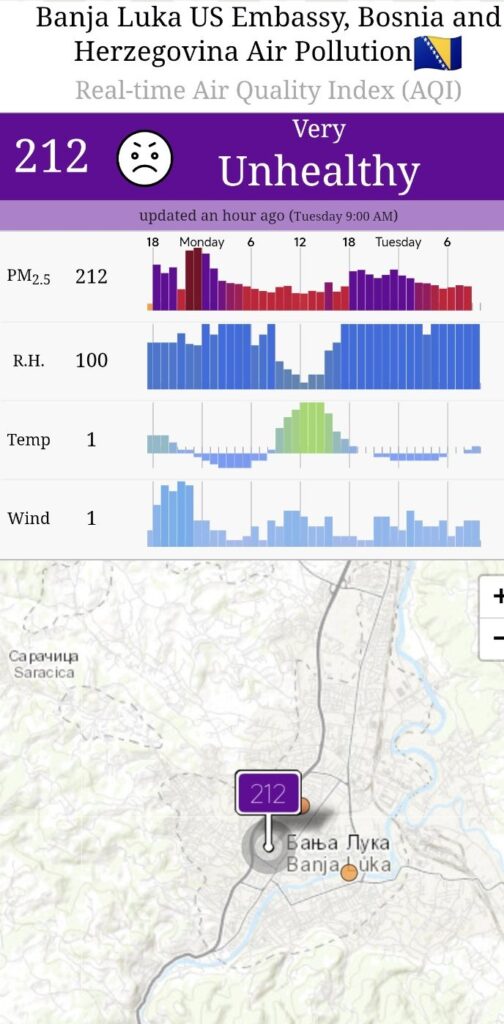Indeks zagađenja i nivo mikročestica PM 2,5, prema internet stranici “aqcin.org” trenutno je 212. Zbog toga vazduh koji jutros udišu Banjalučani je veoma nezdrav, a to znači da je izdato upozorenje u vanrednim uslovima, kako se navodi na ovoj stranici.