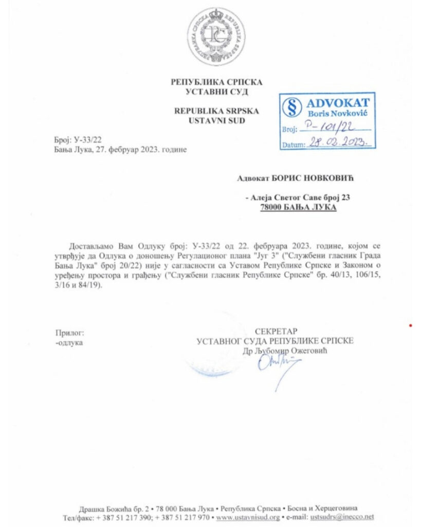 U toj odluci sud je utvrdio da odluka o donošenju Regulacionog plana „Jug 3“ nije donesena u skladu sa Zakonom o uređenju prostora i građenju.