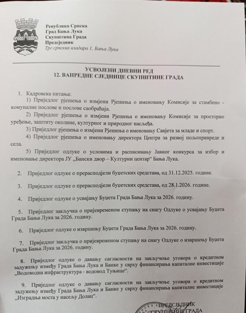 30.01.2026. | 10:11Jednoglasno je usvojen dnevni red na vanrednoj sjednici Skupštine Grada Banjaluka, na kojoj će odbornici raspravljati o devet tačaka.