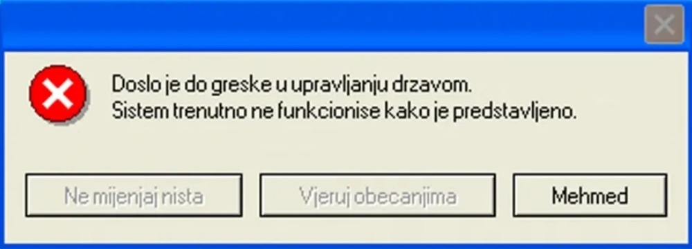 U objavama se problematizuju izborna obećanja iz prethodnih ciklusa. Na grafici su precrtane godine od 1996. do 2022. uz poruku „će biti bolje“, dok ispod stoji naglašeno „2026. će biti bolje“. Pojavljuje se i poruka u formi sistemske greške: „Došlo je do greške u upravljanju državom. Sistem trenutno ne funkcioniše kako je predstavljeno“, uz ponuđene opcije „Ne mijenjaj ništa“, „Vjeruj obećanjima“ i „Mehmed“.