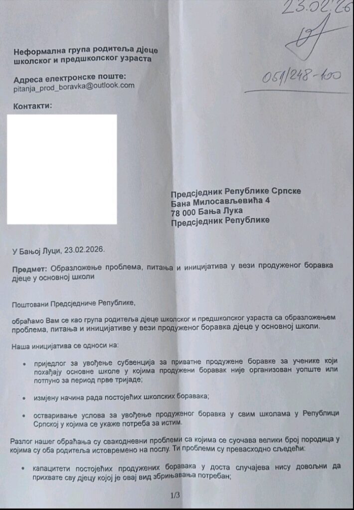 “U dopisu smo jasno ukazali na posljedice koje trenutna situacija ostavlja na djecu i porodice, kao i na potrebu hitnog i sistematskog rješenja tog pitanja kroz uvođenje subvencija i preciznije zakonsko regulisanje oblasti produženog boravka”, navode roditelji iz Banjaluke.