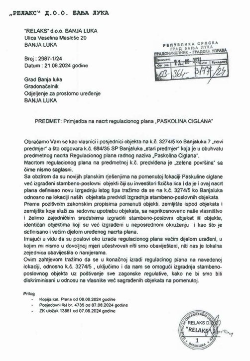 Među podnosiocima primjedbi nalaze se banjalučke firme „Relaks“ i „Rotas“ koje su vlasnici parcela koje gravitiraju prema ulicama Jovana Dučića i Vuka Karadžića.