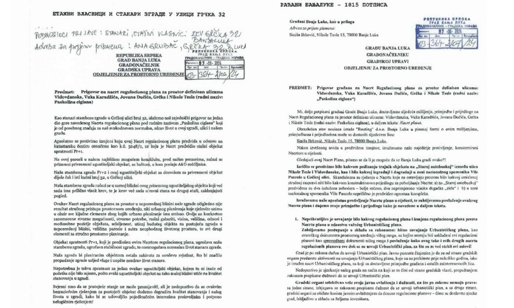 U svojim dopisima navode da je na pojedinim parcelama predviđeno zelenilo, iako se u neposrednoj blizini već nalaze izgrađeni stambeno-poslovni objekti.