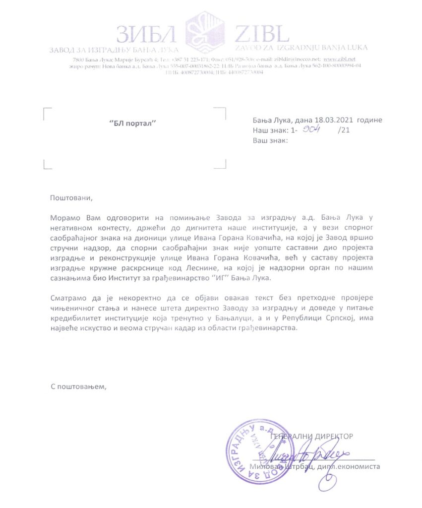 Pogledajte današnji odgovor ZIBL-a koji je potpisao direktor Milovan Štrbac: