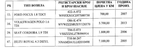 U ovom aktu stoji da prodaju Ford fokus 1,8 TDI, proizvedenog 2007. godine, čiju početnu cijenu su snizili na čak 700 KM. Sudeći prema aktu iz trećeg kruga prodaje, ovo vozilo je koštalo 900 KM.