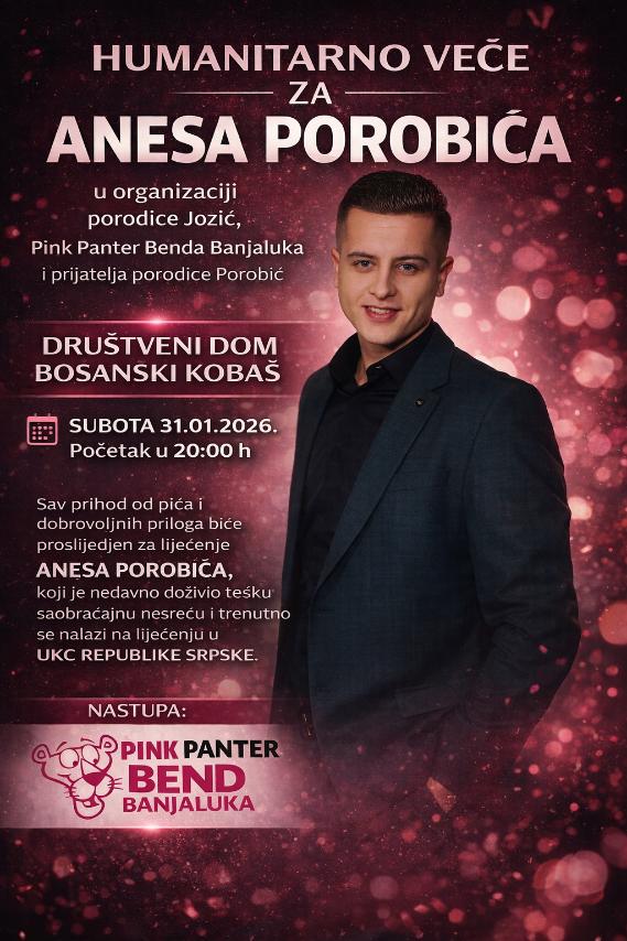 26.01.2026. | 15:41U Društvenom domu u Kobašu kod Srpca, u subotu, 31. januara, sa početkom u 20 časova biće održano humanitarno veče za mladog pjevača Anesa Porobića, koji je prethodne sezone bio zapaženi učesnik muzičkog takmičenja Zvezda Granda.
