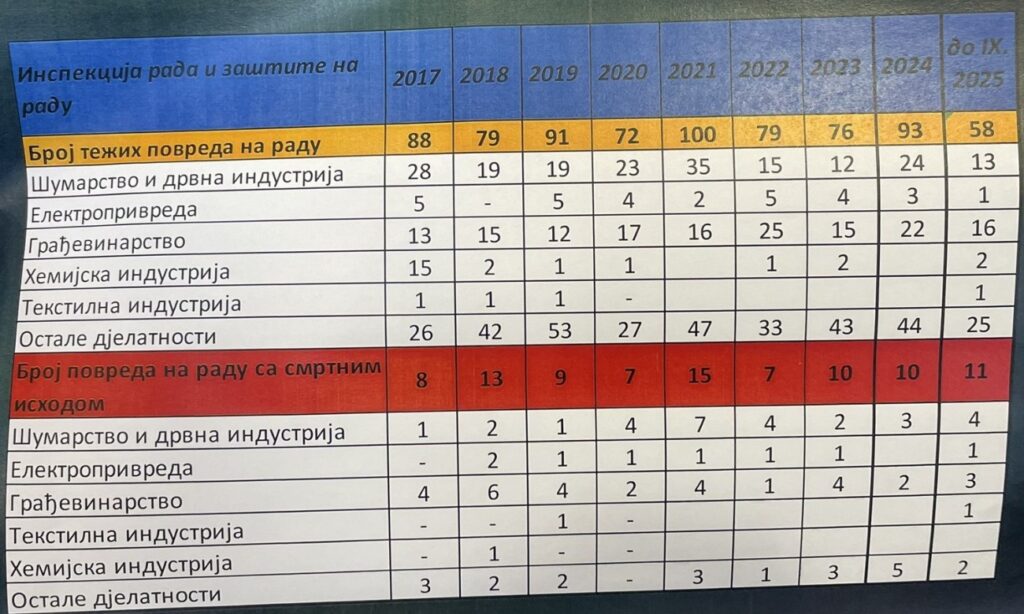 Kada je riječ o povredama sa smrtnim ishodom, broj se u periodu od 2017. do 2024. godine kretao između sedam i 15 godišnje. Najviše smrtnih slučajeva evidentirano je 2021. godine, ukupno 15, dok je u prvih devet mjeseci 2025. godine zabilježeno 11 pogibija radnika.