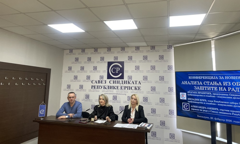 26.02.2026. | 13:04Vanredna sjednica Republičkog odbora Sindikata radnika građevinarstva i stambeno-komunalnih djelatnosti Republike Srpske održana je danas u Banjaluci sa jednom tačkom dnevnog reda – analiza stanja u oblasti zaštite na radu, nakon nedavne pogibije tri radnika u Srpskoj u roku od samo sedam dana.