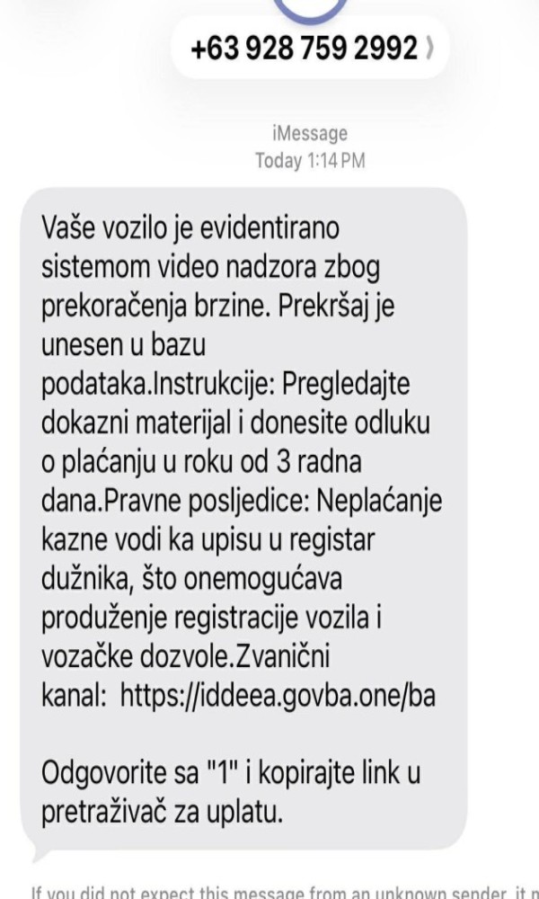 U saopštenju se ističe da se građanima šalju poruke u kojima se lažno navodi postojanje saobraćajnih kazni, hitnih rokova za plaćanje, pravnih posljedica i navodnih registara dužnika, uz dostavljanje sumnjivih internet linkova koji nemaju nikakve veze sa zvaničnim sistemima institucija BiH.