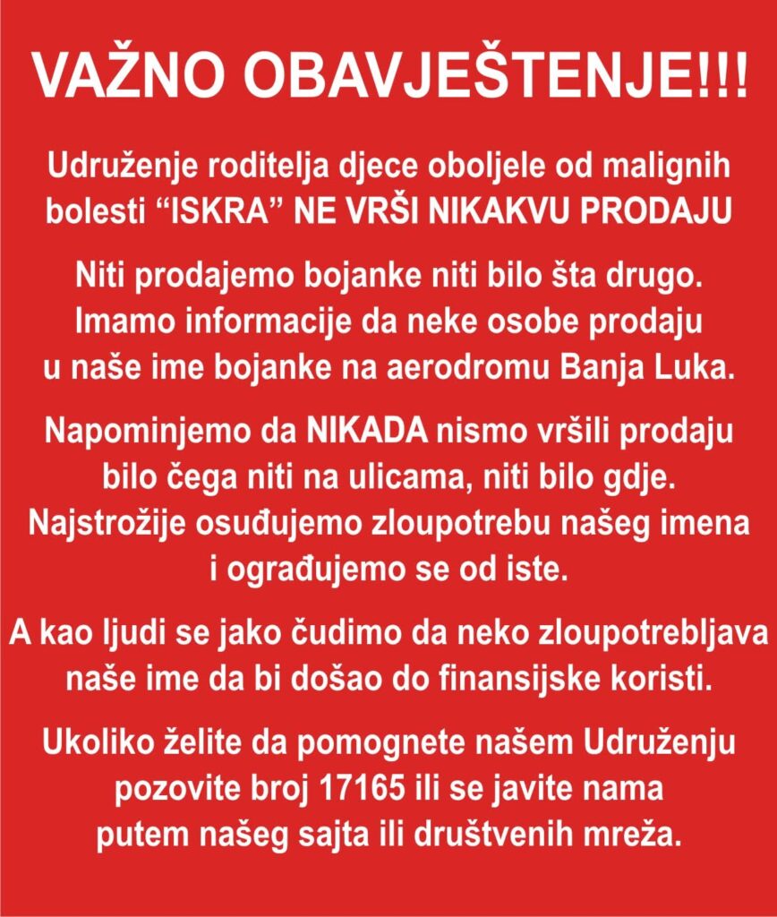 “Niti prodajemo bojanke niti bilo šta drugo. Imamo informacije da neke osobe prodaju u naše ime bojanke na aerodromu Banjaluka. Napominjemo da nikada nismo prodavali bilo šta ni na ulicama, ni bilo gdje drugo. Najsnažnije osuđujemo zloupotrebu našeg imena i ograđujemo se od nje”, navode iz Udruženja “Iskra”.