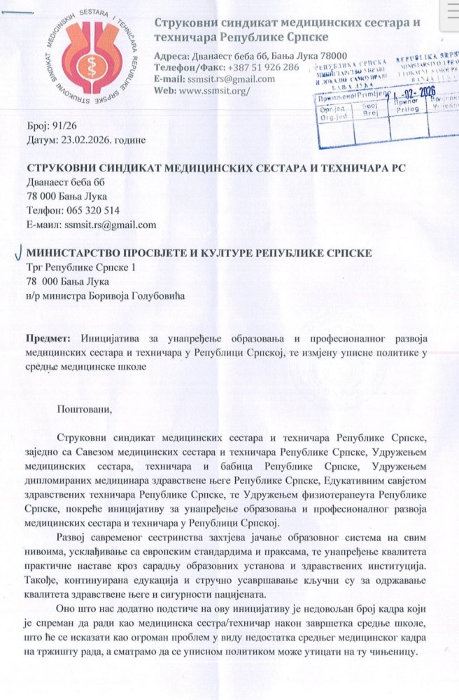 25.02.2026. | 10:32Kadra nam fali, a rješenje nije u sve većem broju prekvalifikacija, upozoravaju zdravstveni radnici iz šest udruženja u Republici Srpskoj, najavljujući inicijativu prema Ministarstvu prosvjete i kulture za unapređenje obazovanja i profesionalnog razvoja medicinskih sestara i tehničara u Republici Srpskoj.