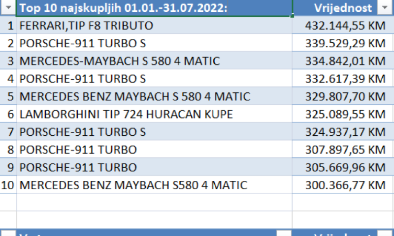 Do desete pozicije nema velikih razlika u cijeni, pa je tako najjeftiniji model na desetoj poziciji, Mercedes Maybach S580, koštao “samo” 300 hiljada maraka. Iznos dažbina za ove modele je takođe sličan, negdje oko 50 hiljada KM.