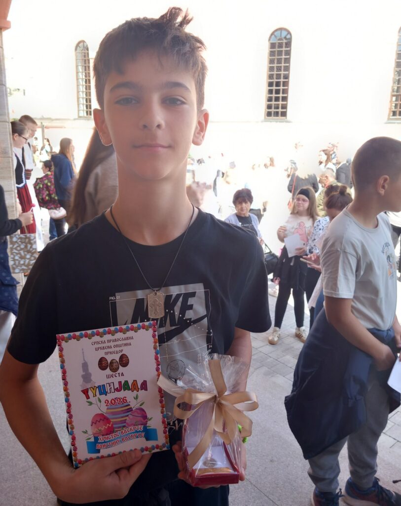 12.04.2026. | 12:56Na tradicionalnoj vaskršnjoj tucijadi, koja je danas po šesti put održana u porti Crkve Svete Trojice u Prijedoru, najjače jaje imao je Ognjen Zdjelar, učenik osmog razreda Osnovne škole /OŠ/ “Desanka Maksimović”, a nagrađen je zlatnikom.