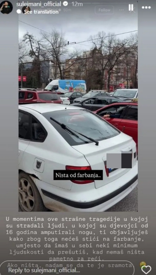 – U momentima ove strašne tragedije u kojoj su stradali ljudi, u kojoj su djevojci od 16 godina amputirali nogu, ti objavljuješ kako zbog toga nećeš stići na farbanje, umjesto da imaš u sebi neki minimum ljudskosti da prećutiš, kad nemaš ništa pametno za reći. Ako ništa, nadam se da te je sramota – napisao je Sulejmani, prenosi Telegraf.