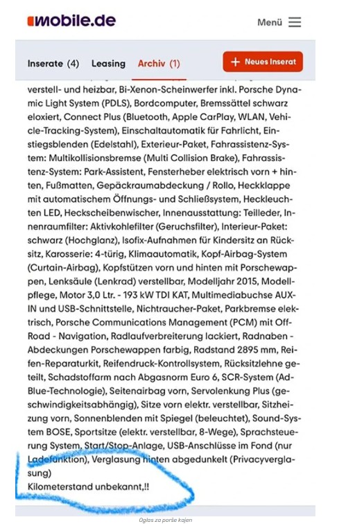 Na fotografijama dostavljenim redakciji pomenutog portala vidi se da je automobil bio oglašen na portalu “mobile.de”, gdje je u opisu vozila, sitnim slovima, navedeno: ‘Kilometraža nepoznata!!’.