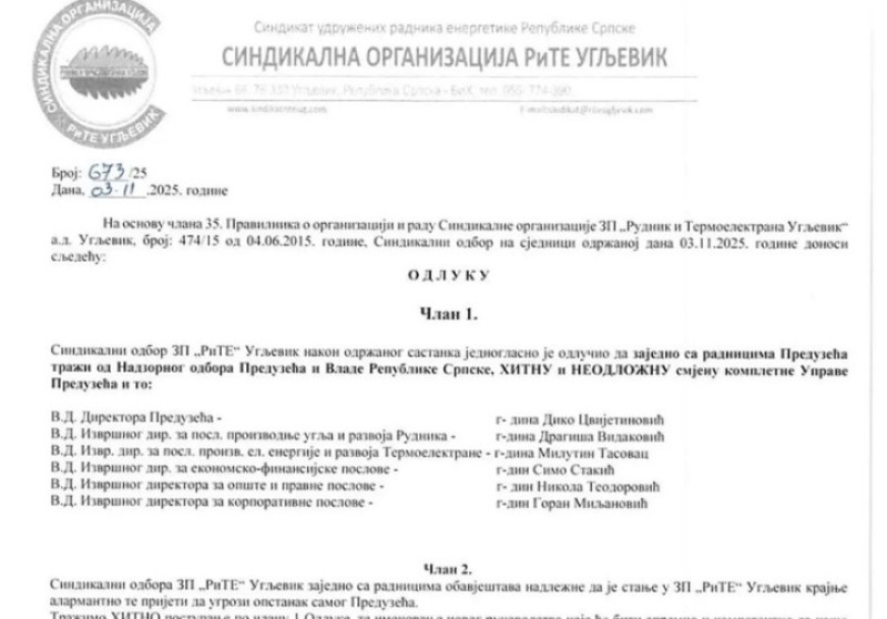 Sindikalni odbor ZP „RiTE“ Ugljevik nakon održanog sastanka jednoglasno je odlučio da zajedno sa radnicima Preduzeća traži od Nadzornog odbora Preduzeća i Vlade Republike Srpske hitnu i neodložnu smjenu kompletne Uprave.