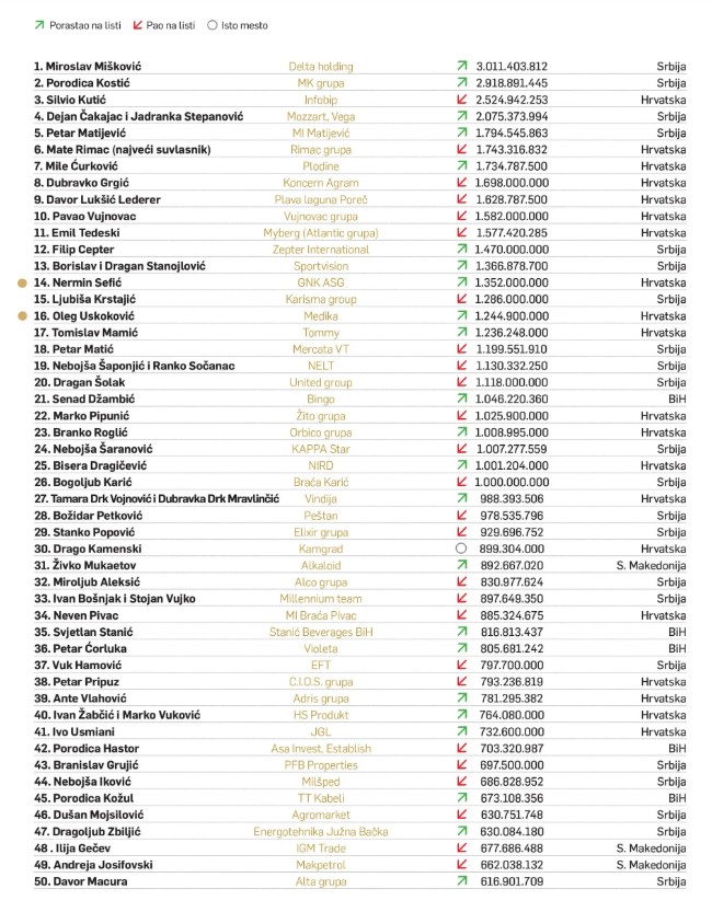 Nije, međutim, baš sve u našem regionu isto kao u razvijenom svijetu. Na primjer, visokotehnološke kompanije koje su prethodne dvije-tri godine predvodile listu 100 najbogatijih sada su u blagom padu. Iako je Srbiju zahvatila velika politička i ekonomska kriza, na Listi 100 najbogatijih najviše je (48) poslovnih ljudi iz Srbije. Poslije dvogodišnje dominacije biznismena iz Hrvatske na vrh liste vratio se tandem iz Srbije. Vlasnik Delta holdinga ponovo je najbogatiji poslovni čovjek u regionu. U stopu ga prati porodica Kostić, koja je uspješno preuzela upravljanje MK grupom.