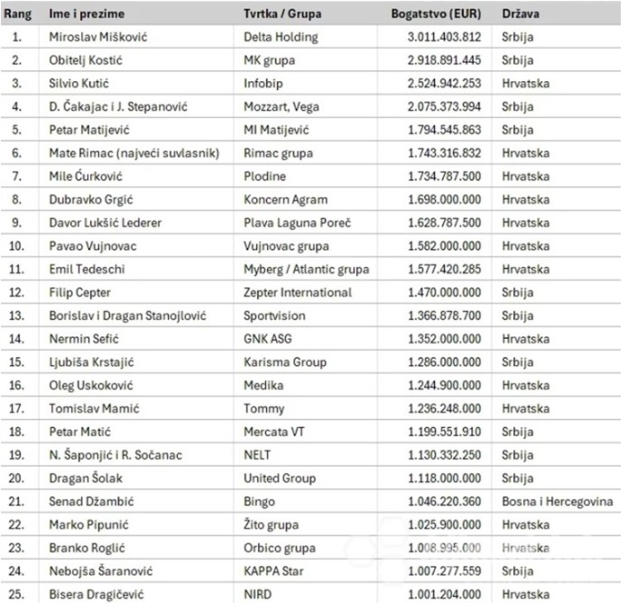 Na listi, očekivano, dominiraju srpski i hrvatski biznismeni, među kojima se po prvi put smjestio i neko iz BiH. Naime, na 21. mjestu nalazi se Senad Džambić, vlasnik Bingo grupacije, koji je prema podacima sa liste “težak” 1.046.220.360 evra.