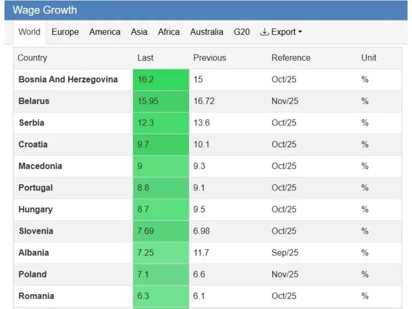 Time su zemlje Zapadnog Balkana i šire regije ubjedljivo nadmašile razvijene ekonomije, uključujući Sjedinjene Američke Države, gdje je rast plata iznosio oko 5 odsto, te brojne zemlje Evropske unije, prema podacima stranice Trading Economics.