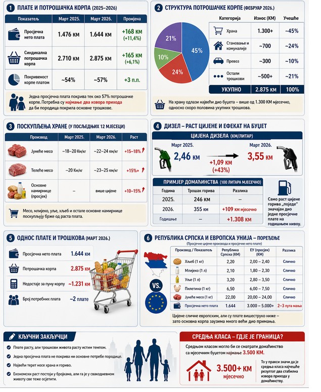 Sindikalna potrošačka korpa: 2.875 KM (februar 2026), rast od oko +165 KM
