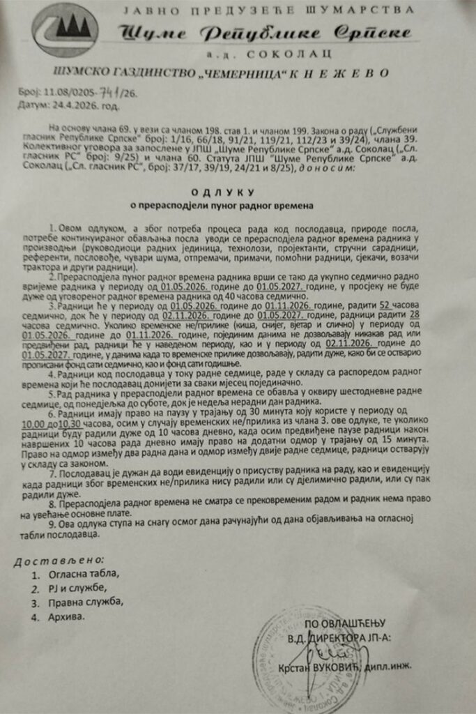 28.04.2026. | 11:51U Šumskom gazdinstvu “Čemernica” Kneževo uvedena je preraspodjela radnog vremena po kojem će radnici morati sedmično da rade i do 52 sata.