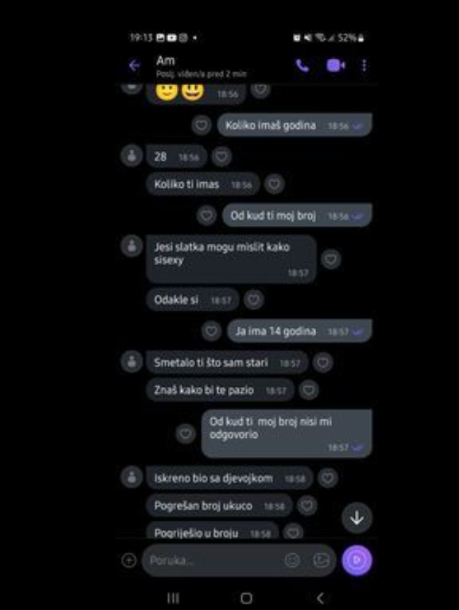 Sreća za maloljetnicu bila je da je prijavila svome ocu da je dobila poruku sa nepoznatog broja na Viber, pa nije pročitala ništa od degutantnog sadržaja koji je muškarac poslao.