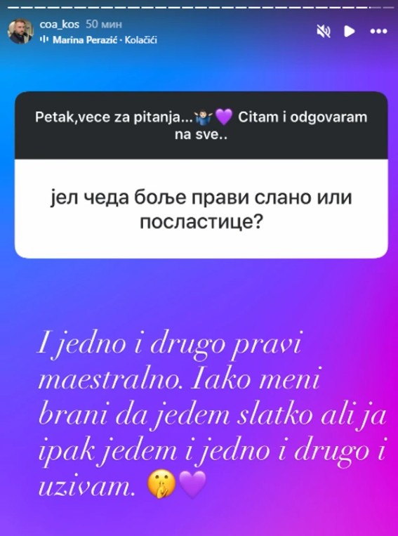 – Da li Čeda bolje pravi slano ili poslastice? – glasilo je pitanje na Instagramu.