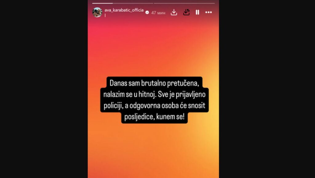 Danas sam brutalno pretučena, nalazim se u Hitnoj. Sve je prijavljeno policiji, a odgovorna osoba će snositi posljedice – napisala je Ava na Instagramu.