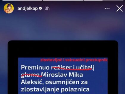 Baš kao i njen kolega Miloš Timotijević, Anđelka Prpić je na društvenim mrežama objavila naslov vijesti koja je glasila: “Preminuo režiser i učitelj glume Miroslav Mika Aleksić”, ali je glumica precrtala dio “režiser i učitelj glume” i iznad napisala: “zlostavljač i s**sualni prestupnik”.