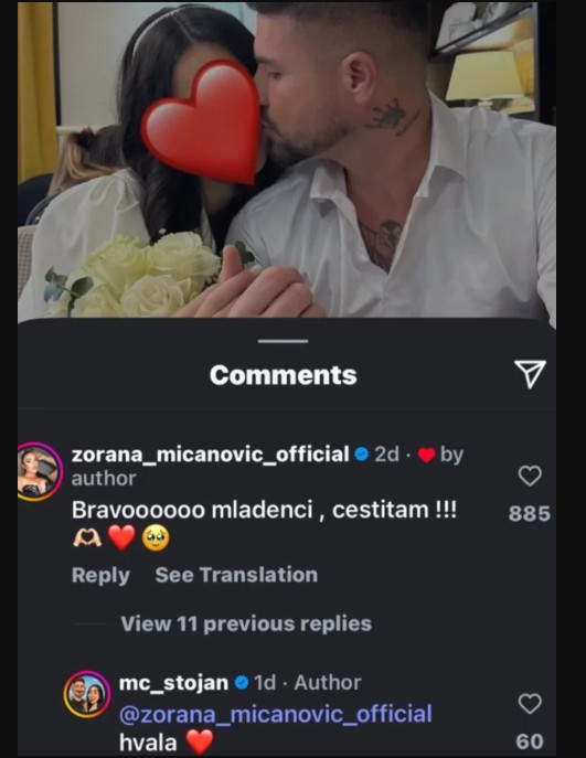– Bravo, mladenci. Čestitam – napisala je pjevačica, na šta joj je Stojan odgovorio: