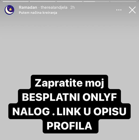 Starleta je napisala: “Zapratite moj besplatni onlyfans nalog u opisu profila”, a onda su uslijedili komentari tviteraša zaprepašćeni njenom objavom i stikerom koji je koristila: “Anđela Veštica promoviše only fans, sa ramazanskim stikerom”, “ovo je strašno”, “svašta, pa hit”…
