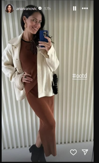 Za svoj, kako je napisala današnji outfit, Ana Ivanović je odabrala usku haljinu u toploj braon nijansi, koju je uparila s bež jaknom i braon čizmama s potpeticom.