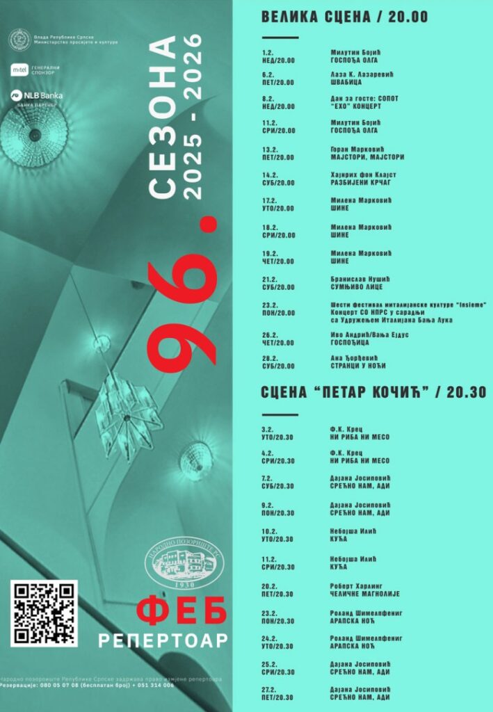 19.01.2026. | 16:23Tokom februara ljubitelje pozorišne umjetnosti u Narodnom pozorištu Republike Srpske (NP RS) očekuje bogat repertoar.