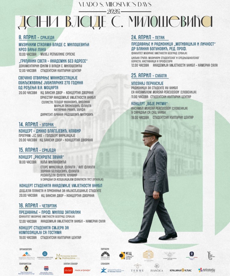 03.04.2026. | 12:55Manifestacija “Dani Vlade S. Miloševića”, koju tradicionalno organizuje Akademija umjetnosti Univerziteta u Banjaluci (AU UNIBL) u saradnji sa Muzikološkim društvom Republike Srpske u znak sjećanja na čuvenog kompozitora, etnomuzikologa i pedagoga, biće održana od 8. do 25. aprila.