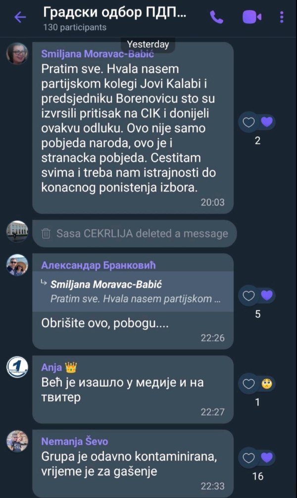 U međuvremenu, u javnosti je objavljen i nastavak Viber prepiske u kojoj se Moravac Babić sugeriše da izbriše poruku i da je grupa, kako se navodi, kontaminirana.