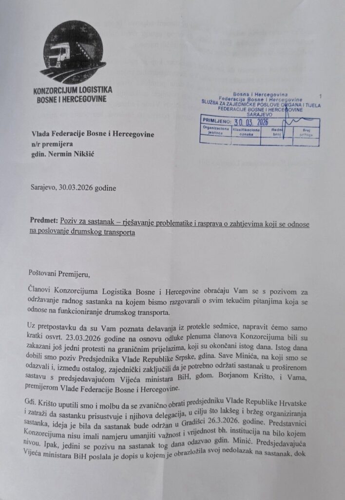 30.03.2026. | 12:37Konzorcijum Logistika BiH danas je na protokol Vlade FBiH dostavila zvaničan poziv za sastanak premijeru Nerminu Nikšiću.