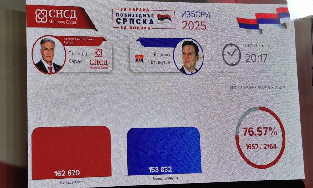 23.11.2025. | 20:32Na osnovu rezultata sa više od 76 odsto obrađenih biračkih mjesta, kandidat SNSD-a Siniša Karan ima prednost, poručio je sa konferencije za novinare porptarol SNSD-a Radovan Kovačevičć.